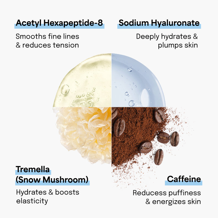 A clinically balanced formula designed for the delicate under-eye area. Powered by Acetyl Hexapeptide-8, Niacinamide, and Hyaluronic Acid, it helps smooth fine lines, reduce puffiness, and brighten tired-looking eyes.