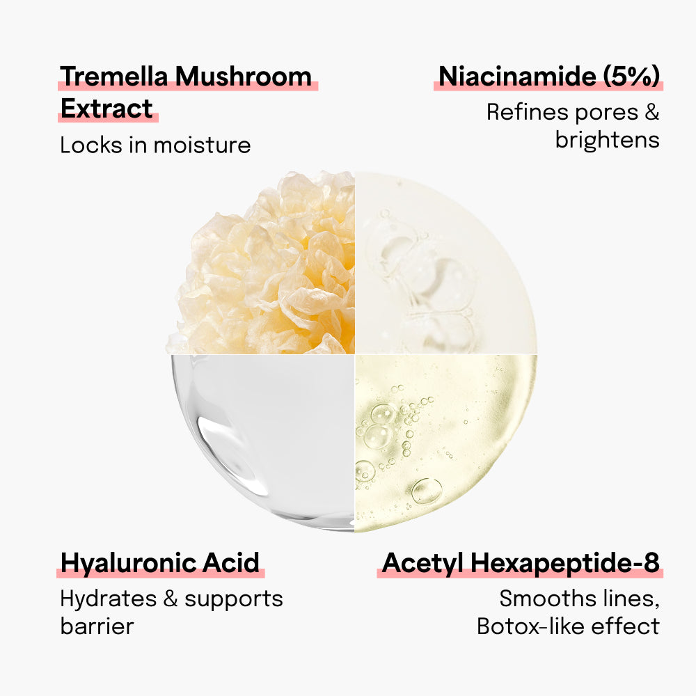 Multi-functional serum powered by 5% niacinamide, hydrating tremella mushroom, and a calming blend of traditional Asian botanicals. Formulated to balance oil, calm sensitivity, refine skin texture, and restore radiance, without heaviness or irritation. A gentle, daily essential for clearer, smoother, and more resilient skin. |